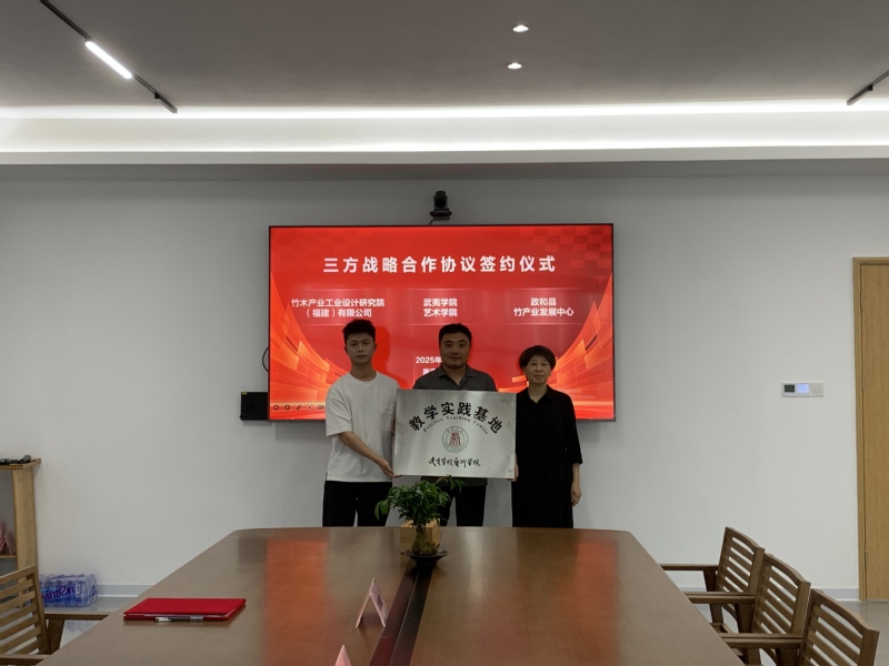 第二站:三方签约,校地企协同,共筑绿色设计生态圈 我校艺术学院、竹木产业工业设计研究院(福建) 有限公司、政和县竹产业发展中心正式签订三方战略合作协议。签约现场,三方代表围绕 “资源共享、人才共育、产业共促” 的目标达成共识:未来,政和县竹产业发展中心将提供区域产业资源与政策支持,竹木产业工业设计研究院 (福建) 有限公司将注入企业实践资源与市场经验,而我校艺术学院则将发挥学科优势与人才储备,共同开展竹材料研发、产品设计创新、专业人才培养等合作。三方将以竹产业为纽带,让课堂教学更贴近产业需求,让学生实践更有落地场景,同时为区域竹产业升级注入高校智慧,实现“校地企共赢” 的良好局面。