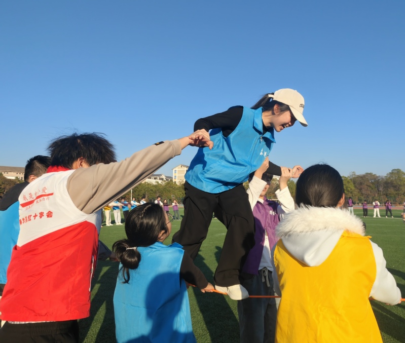 团体心理素质拓展环节设置了“热身操”“桃花朵朵开”“动力绳圈”等生动有趣的活动。现场气氛热烈,同学们在协作中增进了解、激发潜能,不仅锻炼了团队合作与沟通能力,也进一步增强了彼此之间的信任与凝聚力。