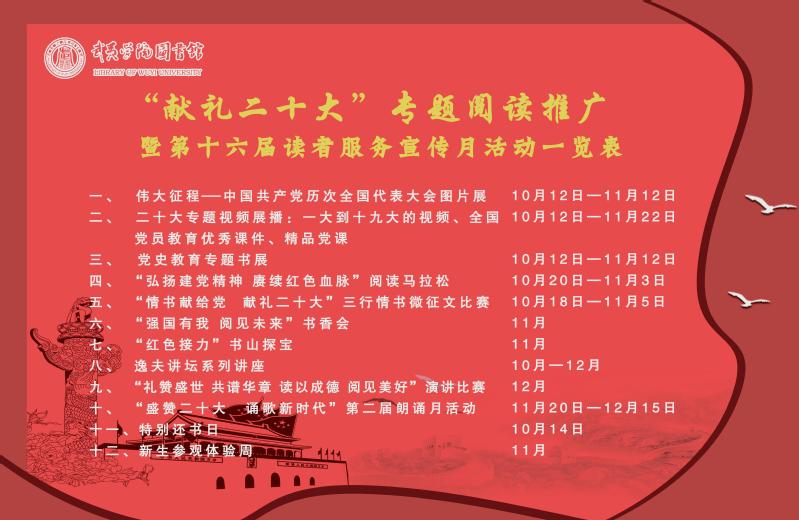 本届读者服务宣传月以“青春向党 强国有我”为主题,采取多样化的推广模式,线上与线下同步,挖掘馆藏文献中的红色读物与线上资源,把党史学习教育专题书展与“党的历次全国代表大会”专题图片展、党史专题优秀课件与会议视频展播、“情书献给党 献礼二十大”三行情书微征文比赛、“红色接力”书山探宝(搜书大赛)、逸夫讲坛系列讲座,以及“红色经典”线上阅读打卡、“每周一书”定期推送、书香会、演讲比赛、朗诵月等内容相结合,打造沉浸式、立体化的党史学习教育平台,引领读者进一步学史明理、学史增信、学史崇德、学史力行,从党的光辉历程中汲取力量,弘扬伟大建党精神,赓续红色血脉,铭记历史,奋发图强,为实现中华民族伟大复兴的中国梦而努力奋斗。