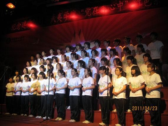 为隆重纪念建党90周年,歌声嘹亮颂党恩,歌唱祖国新时代,校团委举行 “党在我心中”,“红歌唱响青春校园”活动。4月23晚,来自全校十个院系合唱队在校报告厅拉开革命歌曲大合唱的帷幕。校党委副书记姚进生、党政办主任潘之光、团委书记祁少华,各院系分管学生工作的副书记、团总支书记、总辅导员莅临现场,为本次红歌大赛助威。