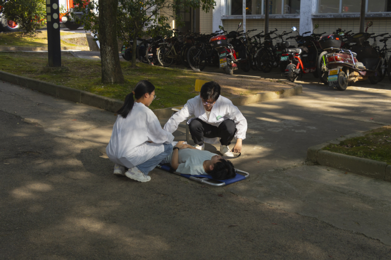 第一阶段应急疏散演练模拟地震应急避险,地震预警终端发出警报,学生公寓的师生员工应急避险,迅速关闭火源、电源,处理好易燃、易爆的物品,就近蹲或趴在桌子、床铺的旁边或承重墙的墙根、墙角,同时抓紧结实物体,用手或其它柔软物品等保护好头部。地震暂停后,模拟3楼宿舍发现火情,开展报警接警程序、消防应急疏散、人员搜救、火灾处置、医疗救护演练。发现火情楼管员立即拨打火情报警电话,并打开一楼所有大门确保畅通楼栋党支部全体党员迅速组成疏散引导先锋队,组织学生有序撤离宿舍楼,安全到达指定疏散点集合。武夷山市消防救援大队和学校微型消防站队员出警开展人员搜救、火灾处置抢险救护组对受伤学生进行救护。