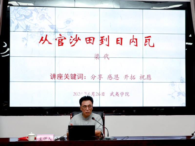 梁代以《从官沙田到日内瓦》为题,围绕分享、感恩、开拓、祝愿等关键词,用生动幽默的语言讲述了自己的成长历程、奋斗足迹和生涯成就,深入阐述其坚持传承弘扬中华优秀传统文化的情况,对同学们给予谆谆教诲和深切期望。