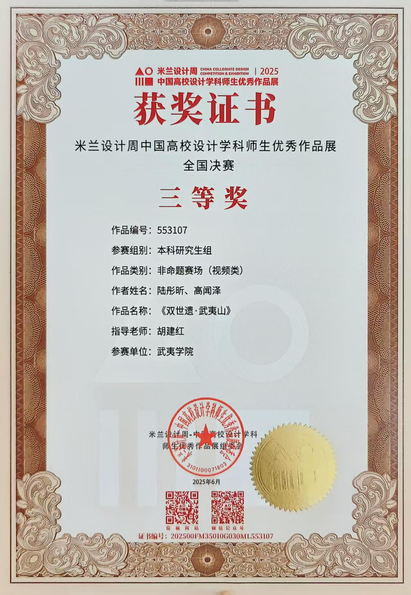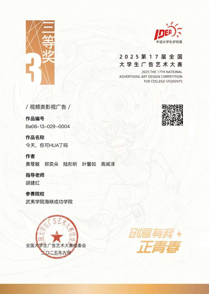 近日,“第17届全国大学生广告艺术大赛”全国总决赛落下帷幕,我校海峡成功学院2022级广播电视编导专业学生黄鹭敏、郑奕朵、陆彤昕、叶馨如、高闻泽创作的影视广告《今天、你可HUA了吗》(指导老师:胡建红)获得国赛三等奖。同时,在“2025米兰设计周中国高校设计学科师生优秀作品展”全国决赛传来佳讯,海峡成功学院2022级广播电视编导专业学生陆彤昕、高闻泽创作的短视频《双世遗·武夷山》(指导老师:胡建红)获得国赛三等奖。