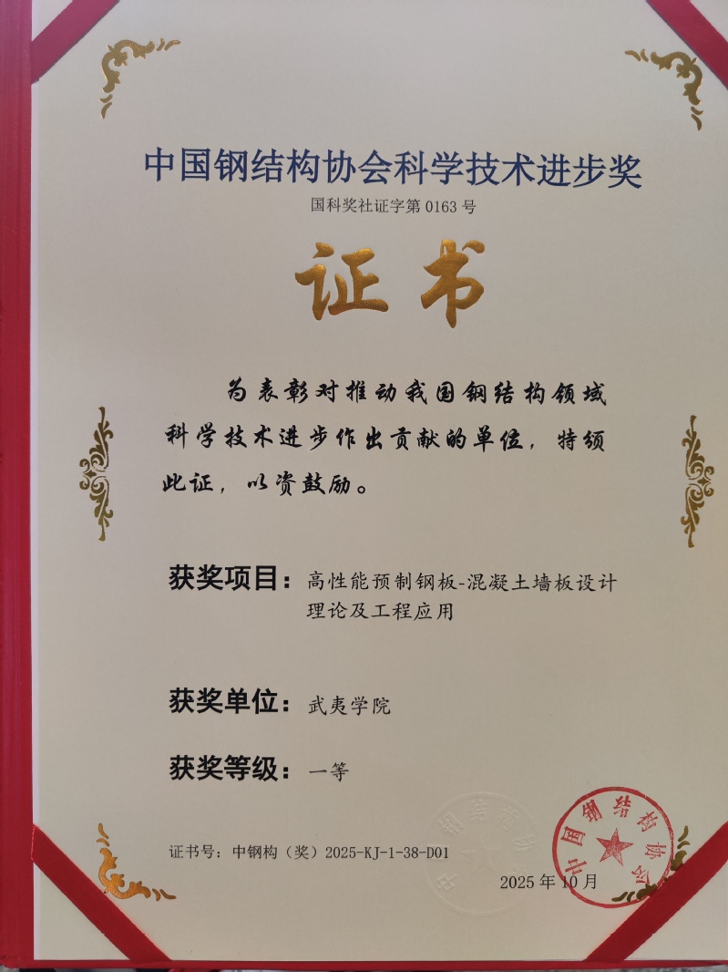近日,2025年度中国钢结构协会科学技术进步奖评审结果揭晓,我校联合哈尔滨工业大学、南平建设集团有限公司、南平高速建设有限公司、福建同成建设集团有限公司、苏交科集团股份有限公司、福建新纪建设集团有限公司和中国核电工程有限公司等单位完成的成果“高性能预制钢板-混凝土墙板设计理论及工程应用”荣获该奖项一等奖,武夷学院为第一完成单位,土木工程与建筑学院王永辉教授(闽江学者讲座教授)、魏木旺副教授、雷能忠教授等为主要完成人。