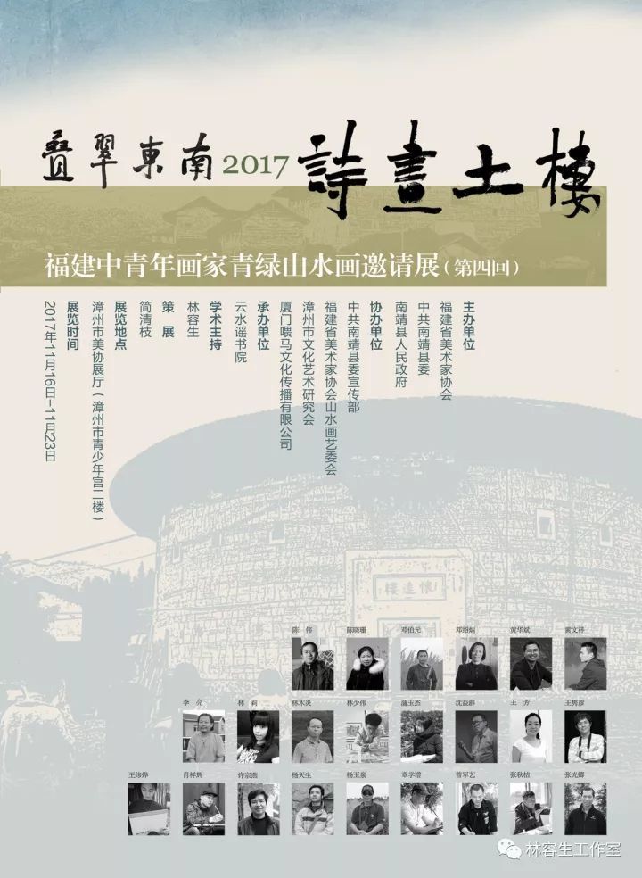 由福建省美术家协会、中共南靖县委 、南靖县人民政府共同主办的“叠翠东南2017诗画土楼”福建中青年画家青绿山水画邀请展于2017年11月16日在漳州市美术家协会(市青少年宫内)隆重开幕。漳州市政协副主席许少钦、中国国家画院著名画家林容生教授、福建省美术家协会副主席庄毓聪、漳州市人大常委会、法制委副主任简清溪、南靖县人大常委会主任曾连端、中共南靖县委常委、宣传部长黄镇平、南靖县政府党组成员张清浪、南靖县政协副主席宋彬出席了开幕式。 2017年5月,中国国家画院著名画家林容生教授携二十多位青年画家,走进梅林、书洋古镇,走进云水谣,为“叠翠东南”的画展创作写生。在随后的半年多时间里,画家们以“诗画土楼”为主题共创作了近百幅作品,并在收获的深秋时节予以展出。以著名旅游胜地“南靖土楼”为题的写生创作展在国内尚属第一次。林容生教授和青年画家们倾心创作,许多作品在空间结构、色调意趣方面做了大胆的探索,形成了有鲜明现代格调的青绿画景物,墨与色、工与写、形与韵兼容,充满诗情画意。此次参展的画家包括林容生、陈伟、陈晓珊、邓伯元、邓绍炳、黄文祥、黄华斌、李亮、林莉、林木炎、林少伟、蒲玉杰、沈益群、王芳、王隽彦、王炜烨、肖祥辉、许宗燕、杨天生、杨玉泉、章学增、张光卿、张秋桔、曾军艺。