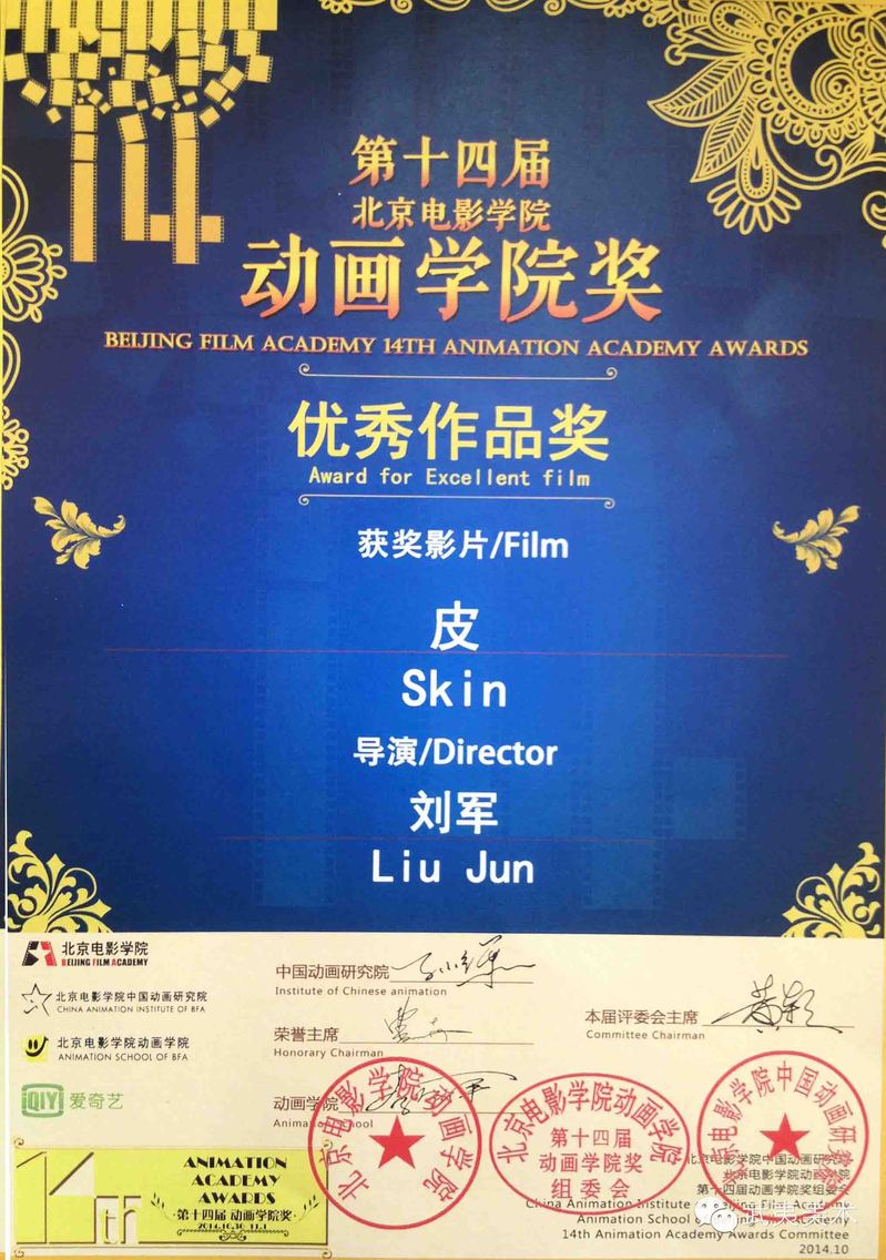 10月30日,由北京电影学院主办的“动画学院奖”在北京人民大会堂开幕。经评委会评选,由我校艺术学院张钰老师指导的动画作品《皮》(作者:刘军、黄奇琪、孙曙曦)获得“优秀作品奖”。