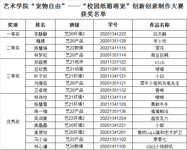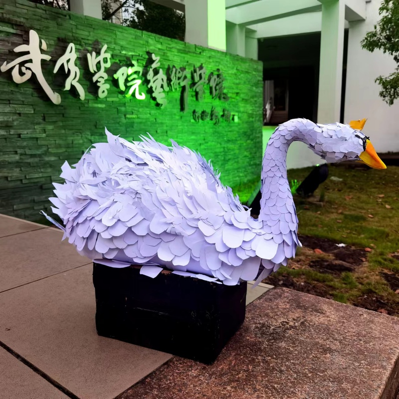 活动自开始以来,受到同学们的深深喜爱,共收到不同品种的纸箱宠物80余只,它们有天鹅、有羊驼、有鳄鱼、有猫咪、有犀牛、有各种各样的狗等。经过评选20级环境设计2班李静静的《白天鹅》获得一等奖。