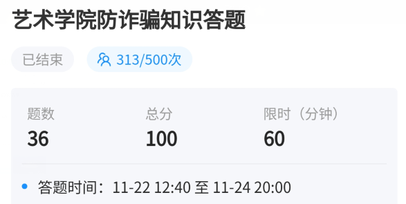 为进一步扩大反诈宣传覆盖面,增强我院学生防诈骗知识,提高防诈骗意识,共建平安校园、无诈校园,我院团委于11月22日-24日开展防诈骗知识答题竞赛。