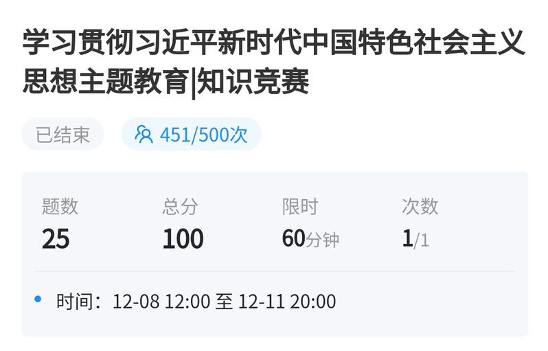 竞赛内容主要围绕习近平新时代中国特色社会主义思想和党的二十大报告展开。每人一次答题机会。共25题,题型包含单选、多选、填空。截止答题活动结束共计451人参与。