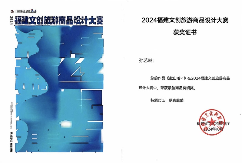 近日,在2024年福建文创旅游商品设计大赛中,我校艺术学院2020级产品设计专业孙艺琳同学(指导老师:张幸荣)经过初赛、复赛等多轮比拼,终在本次比赛中荣获“铜奖”。