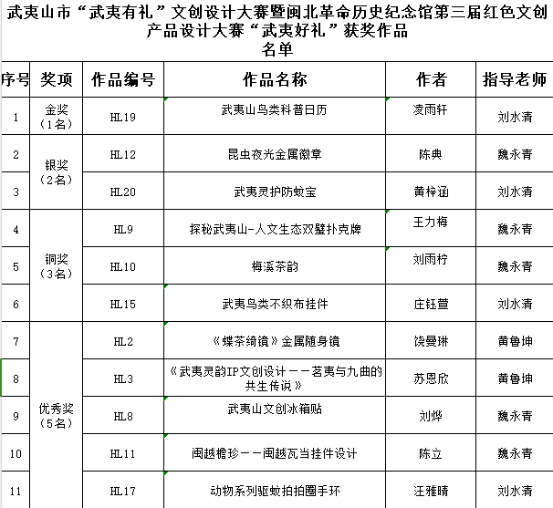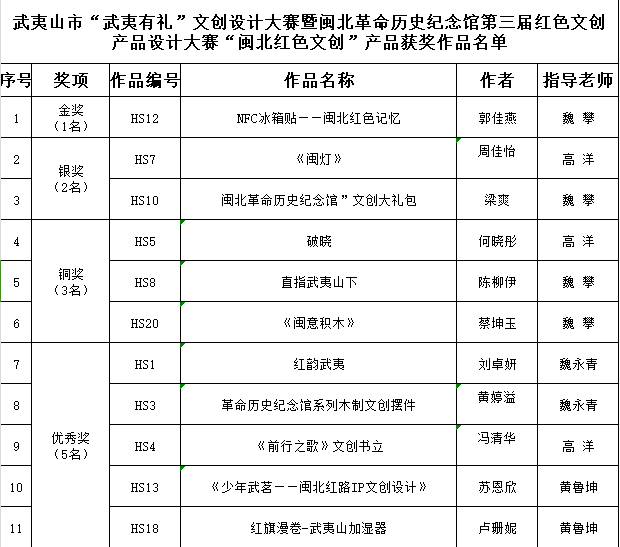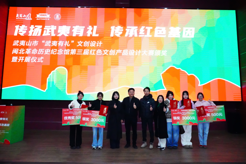 2025年11月21日上午,“武夷有礼”文创设计大赛暨第三届闽北革命历史纪念馆红色文创产品设计颁奖典礼在武夷山景区南入口隆重举行。福建省美术家协会,南平美术家协会、武夷学院艺术学院、闽北革命历史纪念馆、武夷山文旅集团有限公司相关负责人及各界嘉宾出席活动。本届大赛设“武夷好礼”“城市礼物”“闽北红色文创”三大赛道,共收到参赛作品300多件。经评审,共有33件作品获奖。其中,武夷学院艺术学院学生表现优异,共入围60件作品,并在各赛道中均取得佳绩:其中,“武夷好礼”赛道金奖1名;“闽北红色文创”赛道金奖1名;此外,学院学子在银奖、铜奖及优秀奖中也成绩斐然,展现了扎实的专业素养与创新能力。