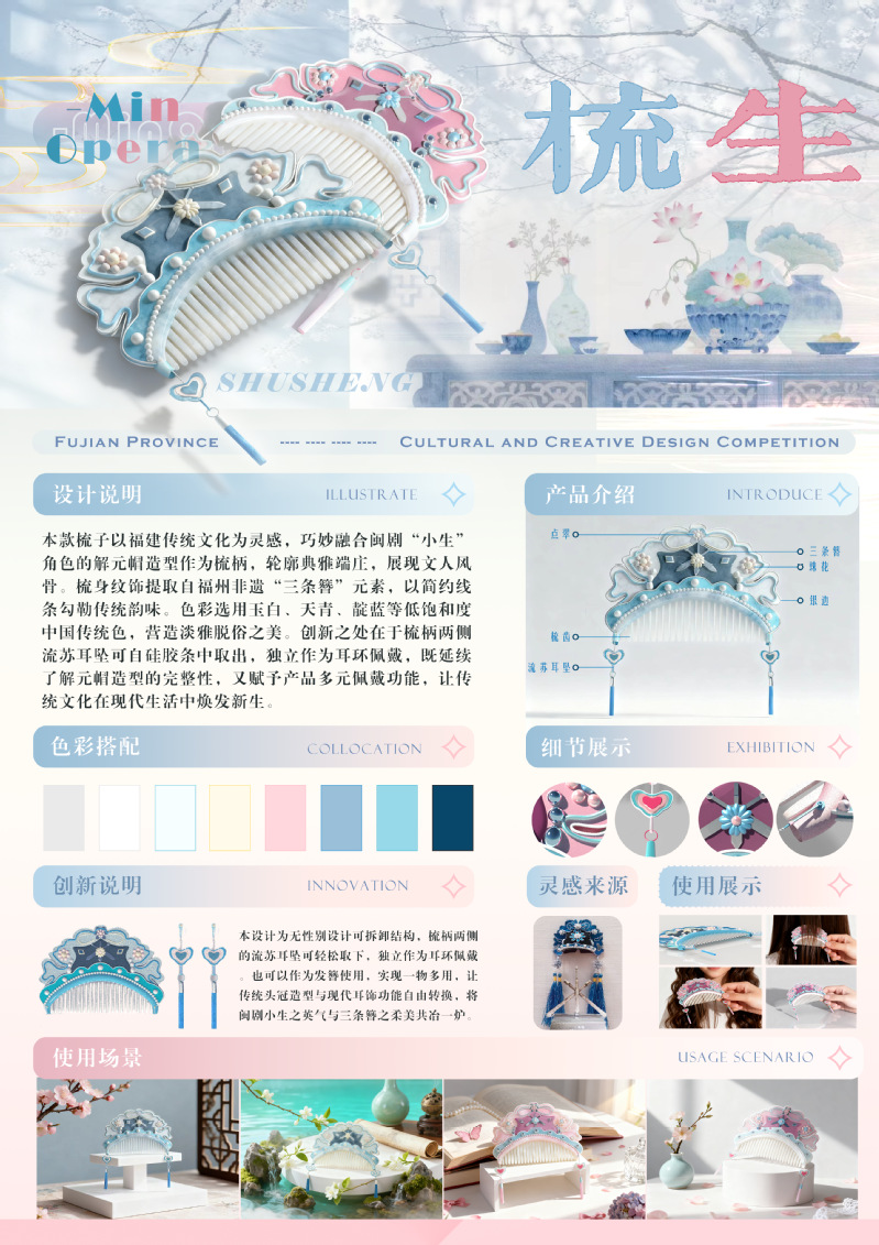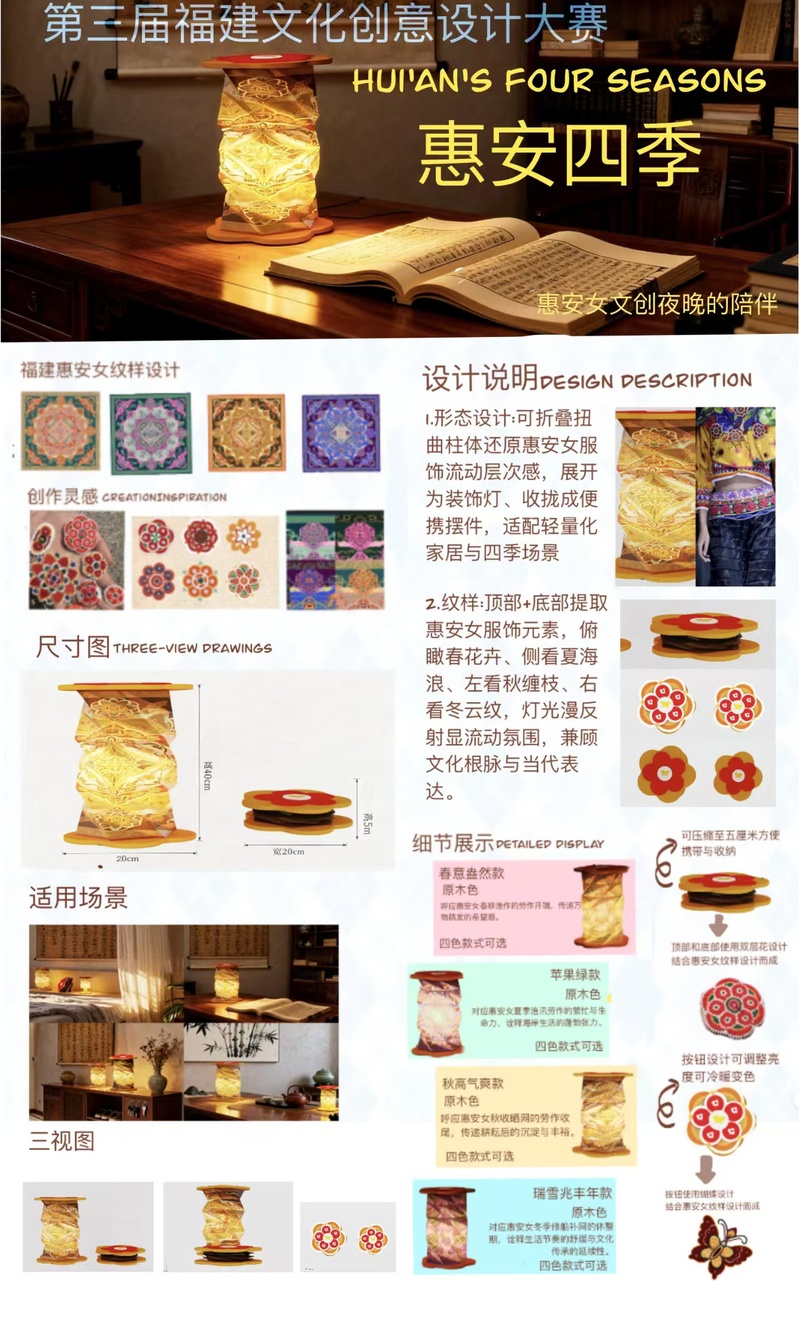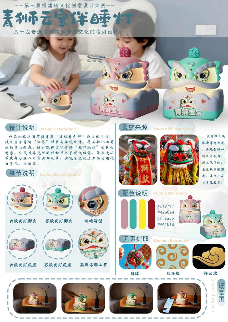 近日,由福建省文化和旅游厅指导,福建省艺术馆(福建省非物质文化遗产保护中心)主办的第三届福建省文化创意设计大赛获奖名单公布。我院2023级产品设计专业林清海同学的作品《青狮云宝伴睡灯》荣获优秀奖(最高奖),吴瑗玉同学的作品《惠安四季》和郑佳怡同学的作品《梳生》荣获入围奖。
