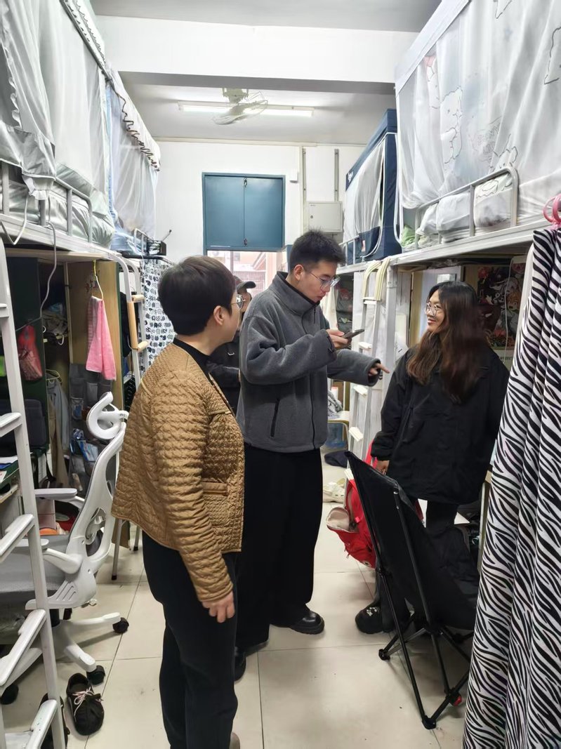 在此基础上,4月3日,院党委书记贾蓉带领全体辅导员,深入学生宿舍开展节前安全专项检查。检查过程中,贾蓉书记与同学们亲切交流,反复叮嘱离校前务必切断电源、关好门窗,出行注意人身财产安全,留校学生要自觉遵守宿舍管理规定,保持与辅导员和家长的联系畅通等。