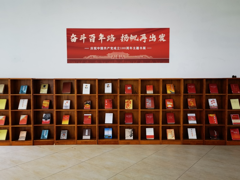 为庆祝中国共产党成立100周年,图书馆在一楼大厅举办“奋斗百年路 扬帆再出发”红色主题书展。